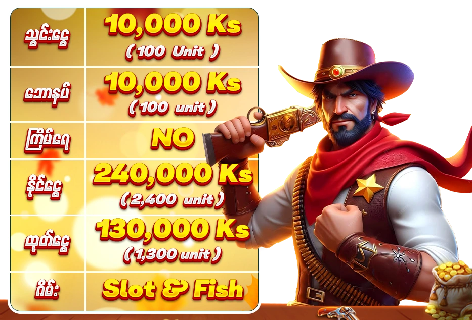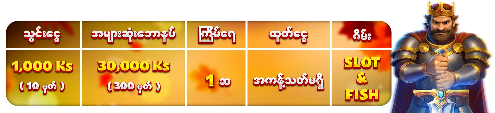 A အေကာင့္တစ္ရက္မွာ စုစုေပါင္း သြင္းေငြ 60,000 ( 600 မွတ္ ) ႏွင့္ အထက္ Slot ႀကိမ္ေရ 1,200 ျပည့္ရင္ ဖရီး 10,000 ရမည္